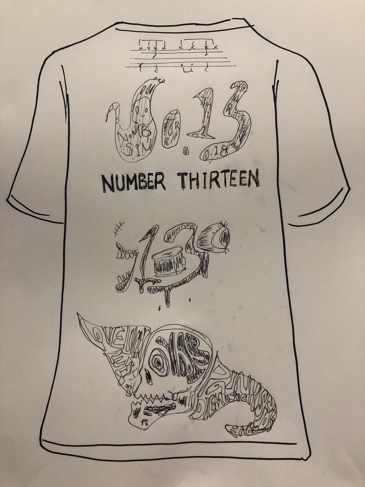 新旧のブランドロゴやイラストに加え、ドラムの譜面が立ち並ぶバックプリントです。